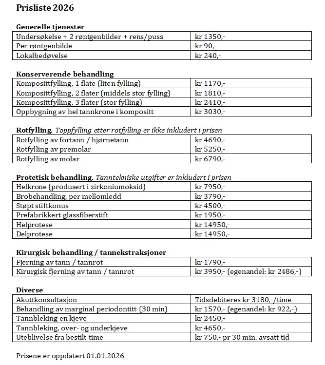 En tannsjekk hos oss koster kr 1 350,- og inkluderer: